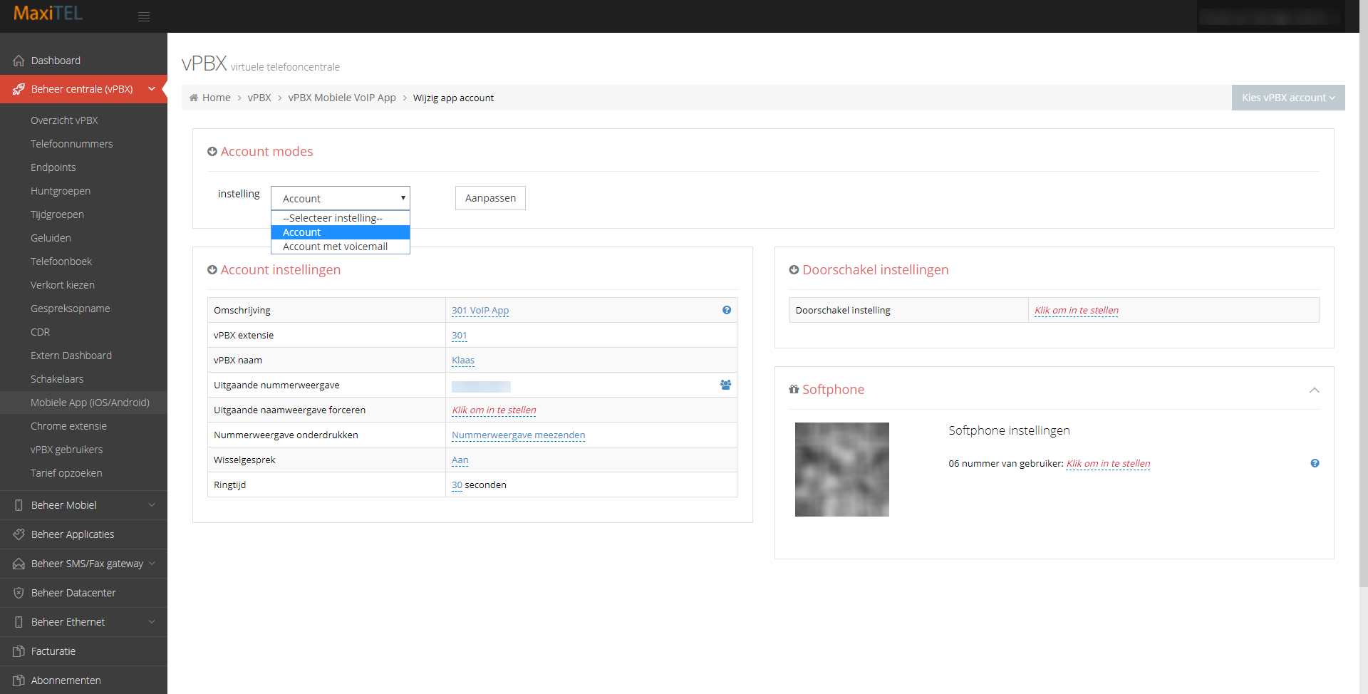 Hier kunt u een intern nummer toewijzen om het account intern te kunnen bellen. Bijv 301
